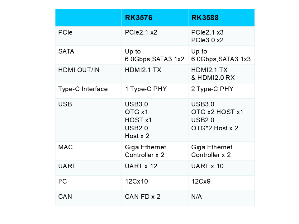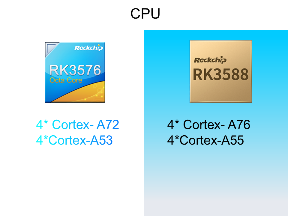 सीपीयू प्रदर्शन: RK3588 क्वाड-कोर कॉर्टेक्स-ए 76 + क्वाड-कोर कॉर्टेक्स-ए 55 का उपयोग करता है, जबकि RK3576 लागत विचारों के लिए क्वाड-कोर कॉर्टेक्सा 72 + क्वाड-कोर कॉर्टेक्स-ए 53 आर्किटेक्चर का उपयोग करता है, और एआरएम कॉर्टेक्स एम 0 कॉपरोसेसर से सुसज्जित है, जो संबंधित अनुप्रयोगों के लिए अधिक संभावनाएं पैदा करता है।