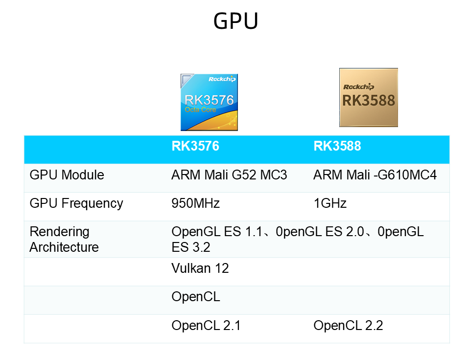 वे दोनों OpenGL ES 1.1, 2.0 और 3.2, वल्कन 1.2 का समर्थन करते हैं, लेकिन RK3588 OpenCL संस्करण में अधिक है (RK3588 2.2 का समर्थन करता है)।