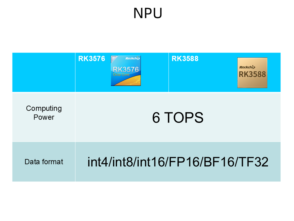 RK3588 और RK3576 6TOPS कंप्यूटिंग पावर से लैस हैं, डेटा प्रारूपों जैसे कि INT4INT8/INT16/FP16/BF16/TF32, और AI एप्लिकेशन की एक किस्म के लिए उपयुक्त हैं। परिदृश्य।