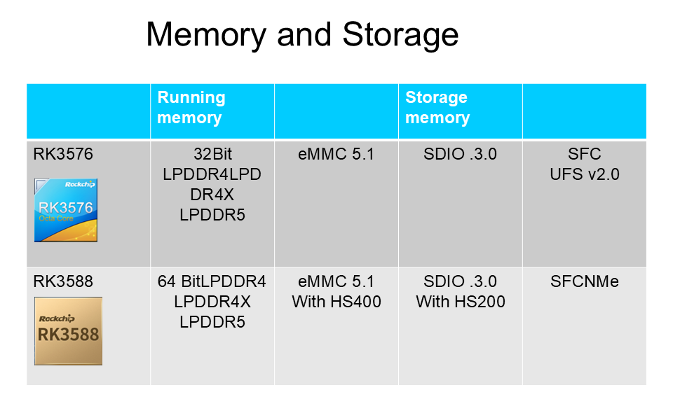 RK3588 समर्थन करता है64-बिटLPDDR4/LPDDR4X/LPDDR5, EMMC5.1: HS400 के साथ, HS200 के साथ SDI03.0, और NME और SFC। दोनों मेमोरी डेटा बिट चौड़ाई (64 बिट बनाम 32 बिट) में अलग हैं।